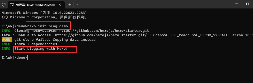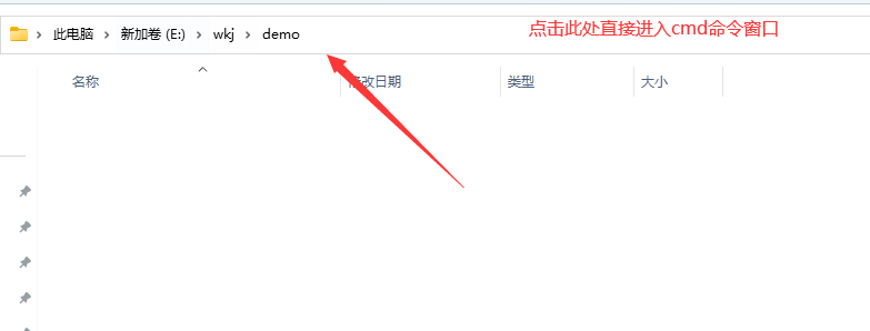 - 在目标路径(我这里选的路径为【E:\wkj\demo】)打开cmd命令窗口